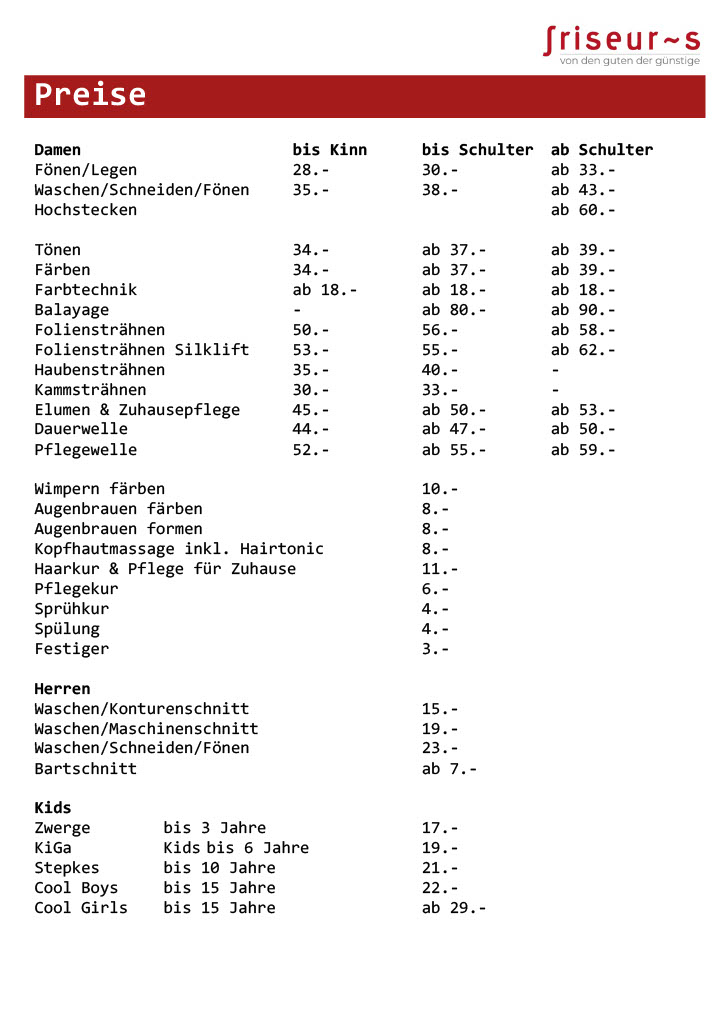 Unsere Preisliste